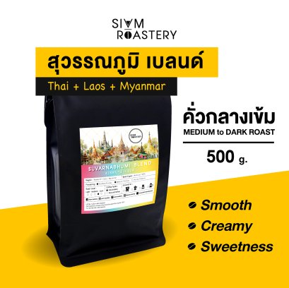 เมล็ดกาแฟ สุวรรณภูมิ เบลนด์ เป็นเมล็ดกาแฟเบลนด์พิเศษ ที่เราเลือกใช้กาแฟในพื้นที่สุวรรณภูมิ จาก 3 ประเทศ ไทย ลาว พม่า ผ่านการคั่วระดับกลางค่อนเข้ม เมื่อนำมาผสมกัน ทำให้ได้รสชาติที่หอม หวาน นุ่มสมูท นวล